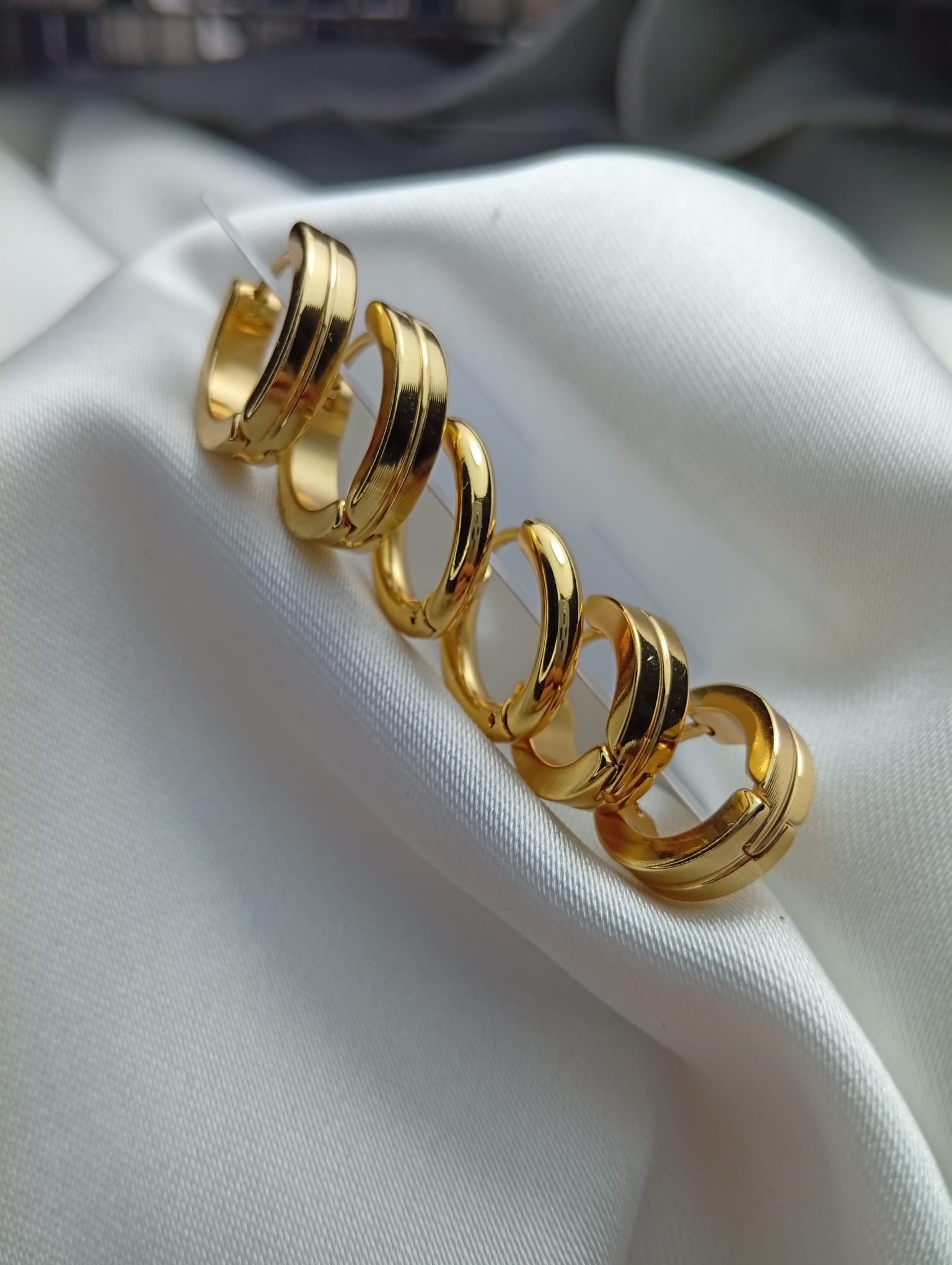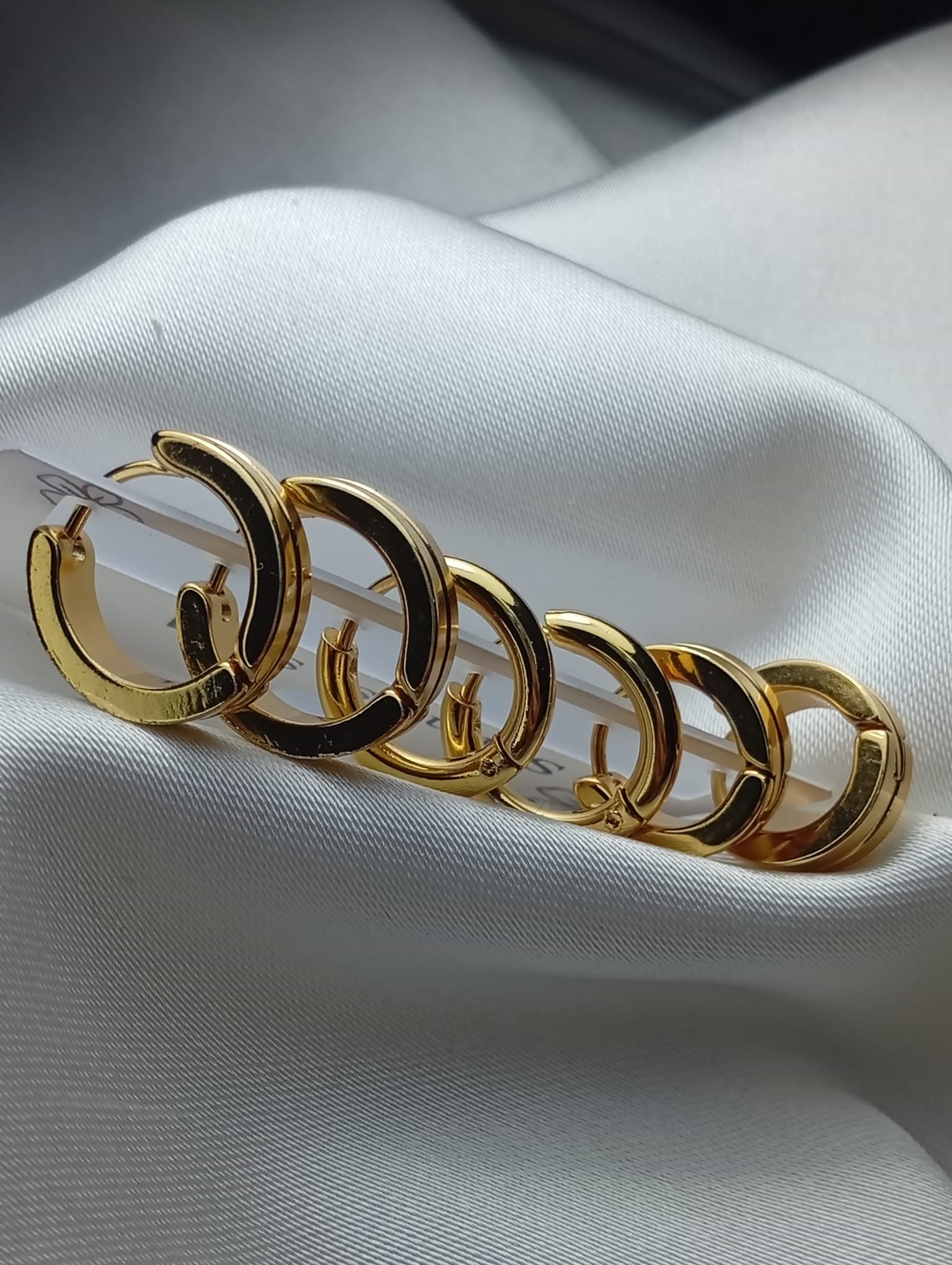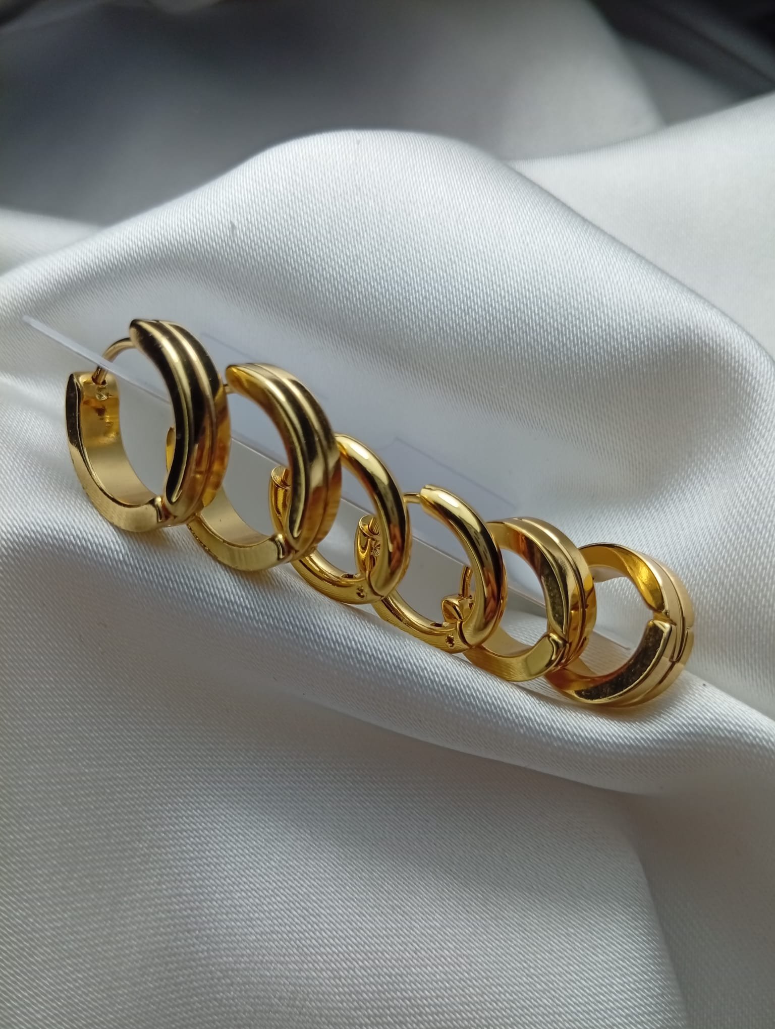 Zarif altın kaplama halka küpe seti, farklı boyutlardaki halka tasarımlarıyla her stile uyum sağlıyor.