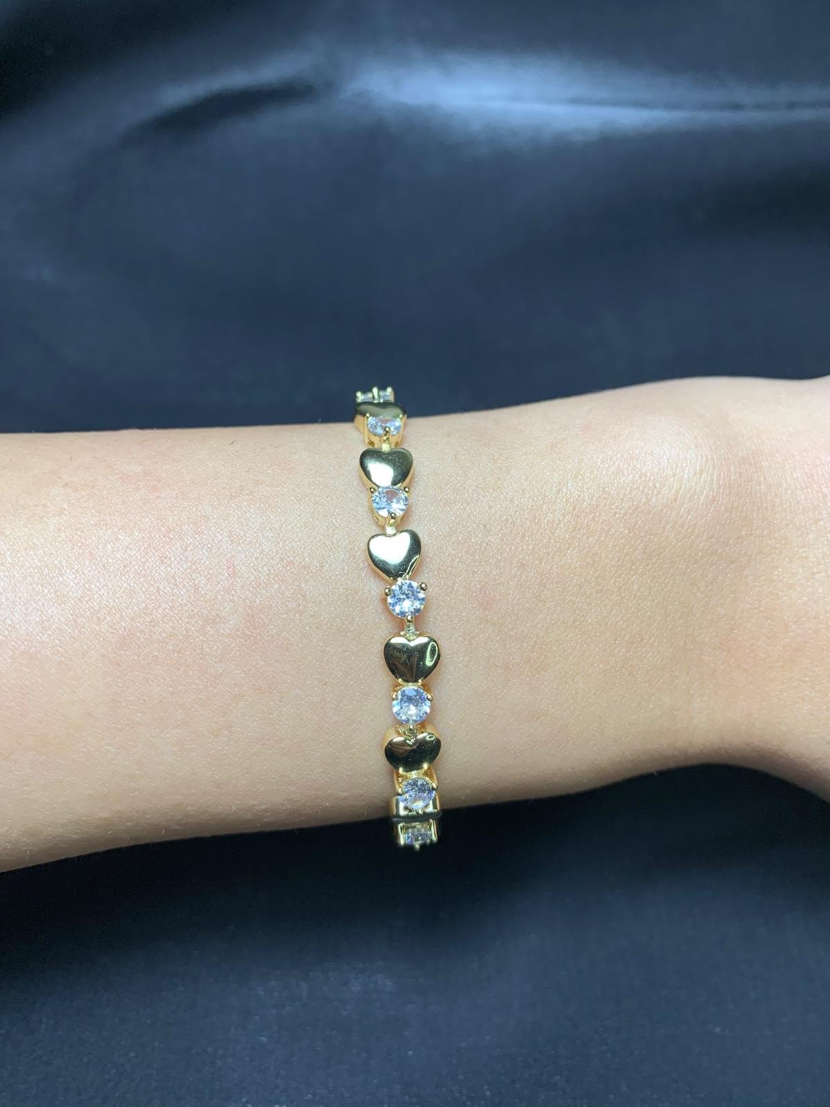 Kalp formundaki altın detaylar ve parlayan taşlarla tasarlanan bu bileklik, günlük şıklığını tamamlamak ya da özel davetlerde zarafetini ön plana çıkarmak için ideal.