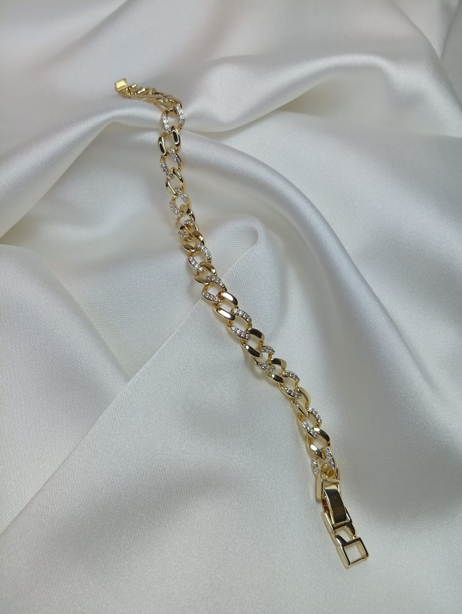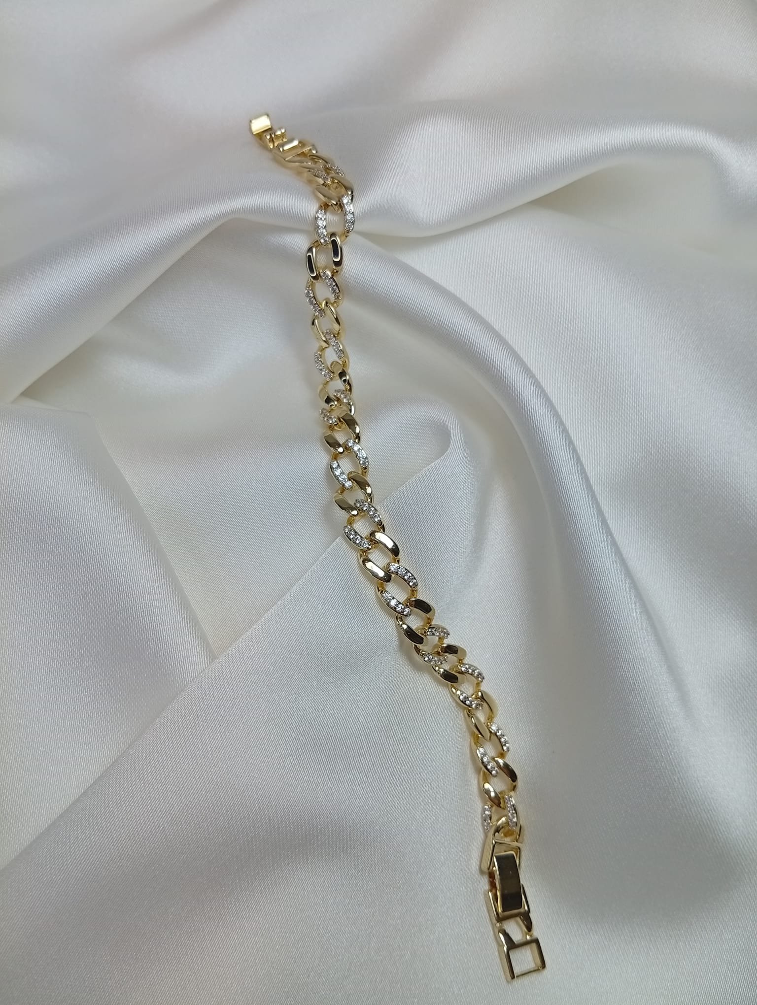 Parlak zirkon taşlarla süslenmiş bu altın zincir bileklik, her kombine ışıltılı bir dokunuş katıyor. Günlük tarzına sofistike bir hava katmak veya gece şıklığını tamamlamak için mükemmel bir tercih.