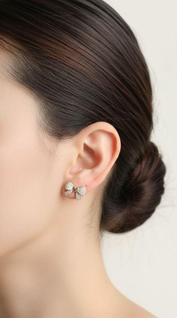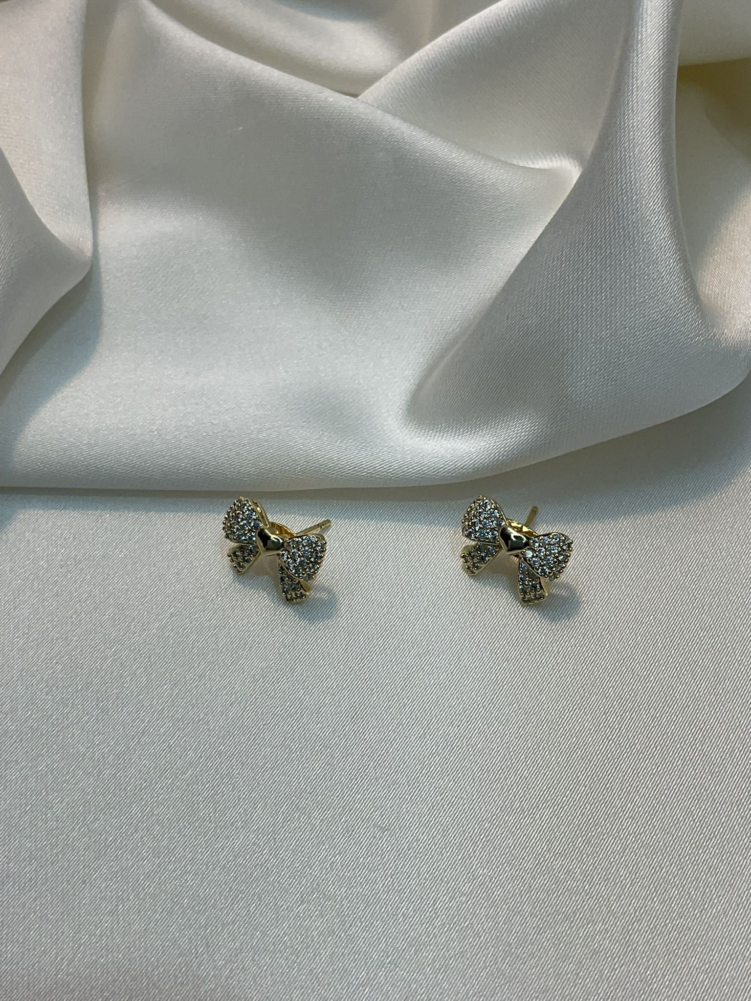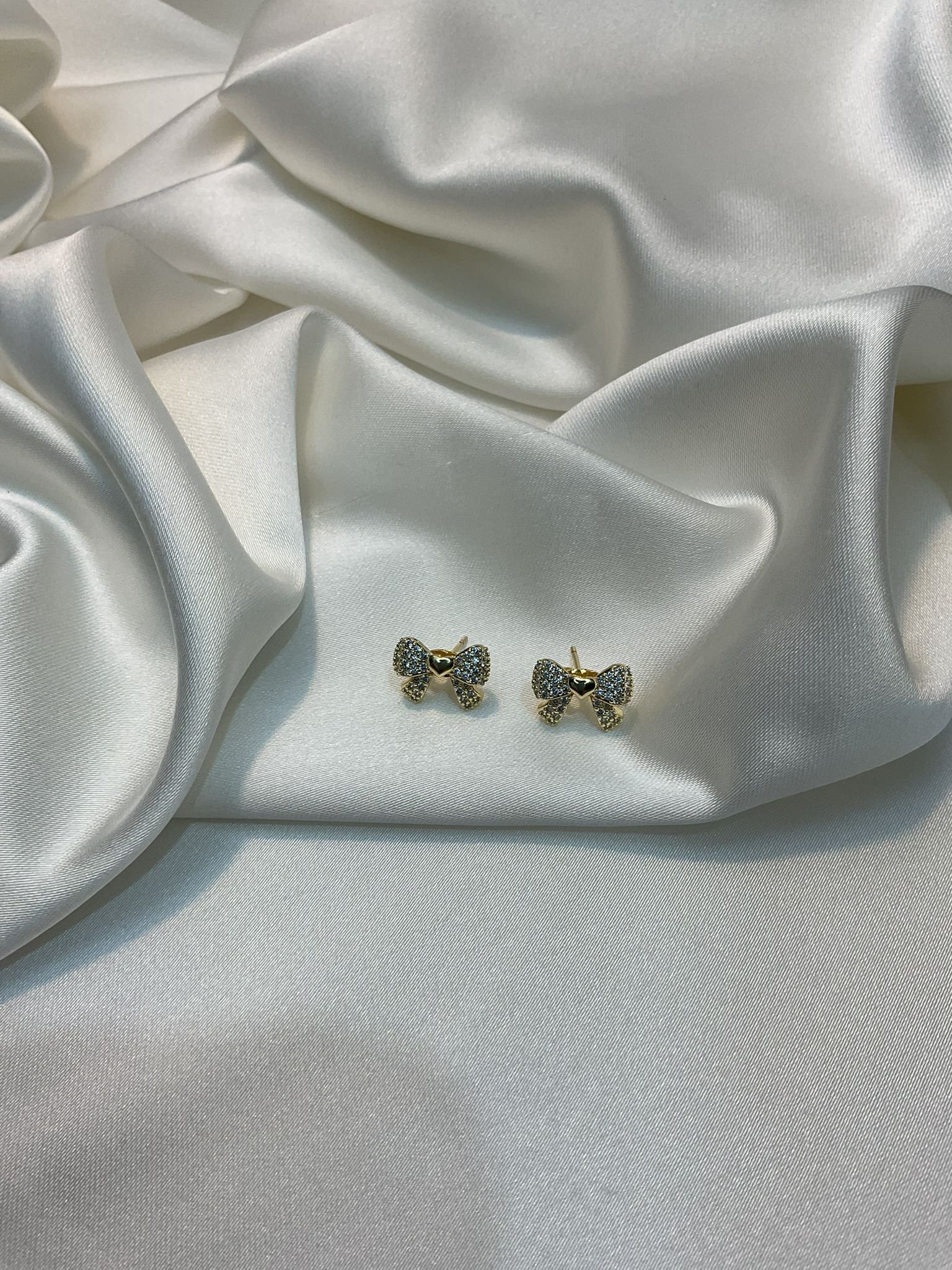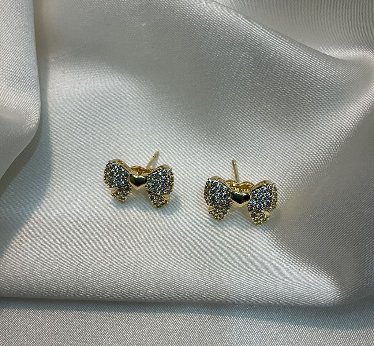 Zarif altın renkli papyon tasarımlı küpeler, ortasındaki minik kalp detayıyla göz kamaştırıyor. Parlak zirkon taşlarla süslenen bu küpeler, günlük kullanımda veya özel günlerde şık bir tamamlayıcı.