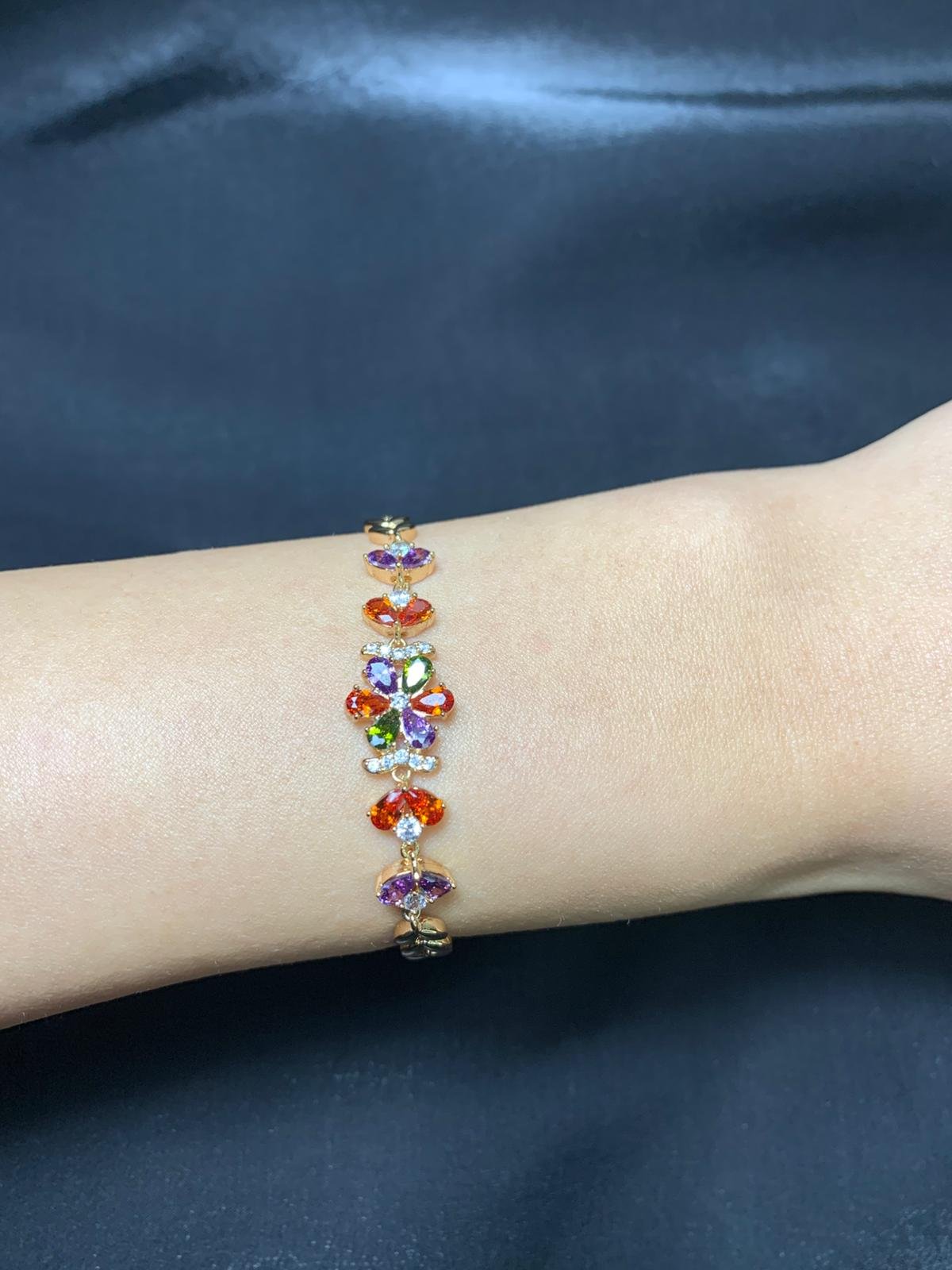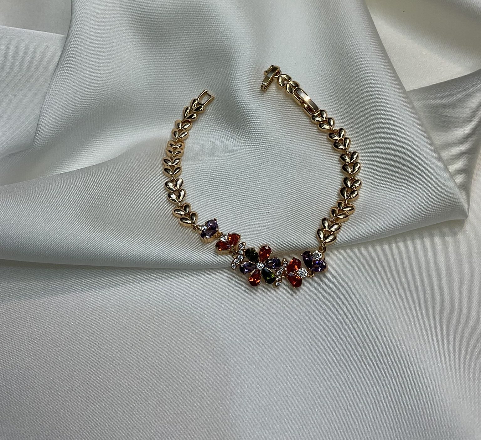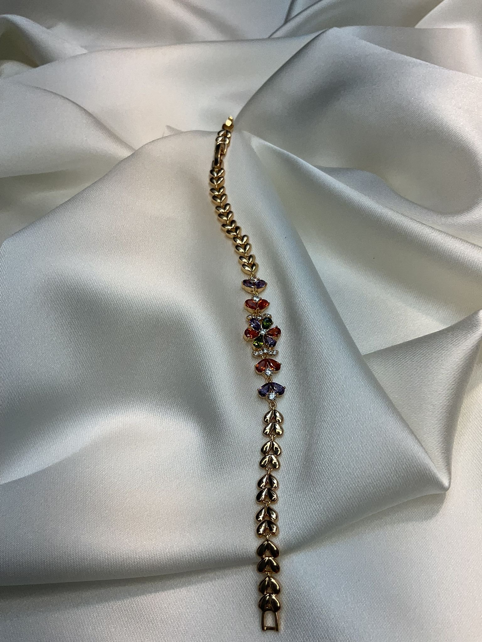 Işıltılı detaylarıyla dikkat çeken Renkli Taşlı Zarafet Bileklik, renkli taşların enerjisini zarif bir tasarımla buluşturuyor. Her taşın ayrı bir anlam taşıdığı bu özel parça, hem günlük kombinlere canlılık katıyor hem de özel günlerde sofistike bir dokunuş sunuyor. Altın renkli yaprak zinciriyle feminen ve modern bir görünüm oluşturur.