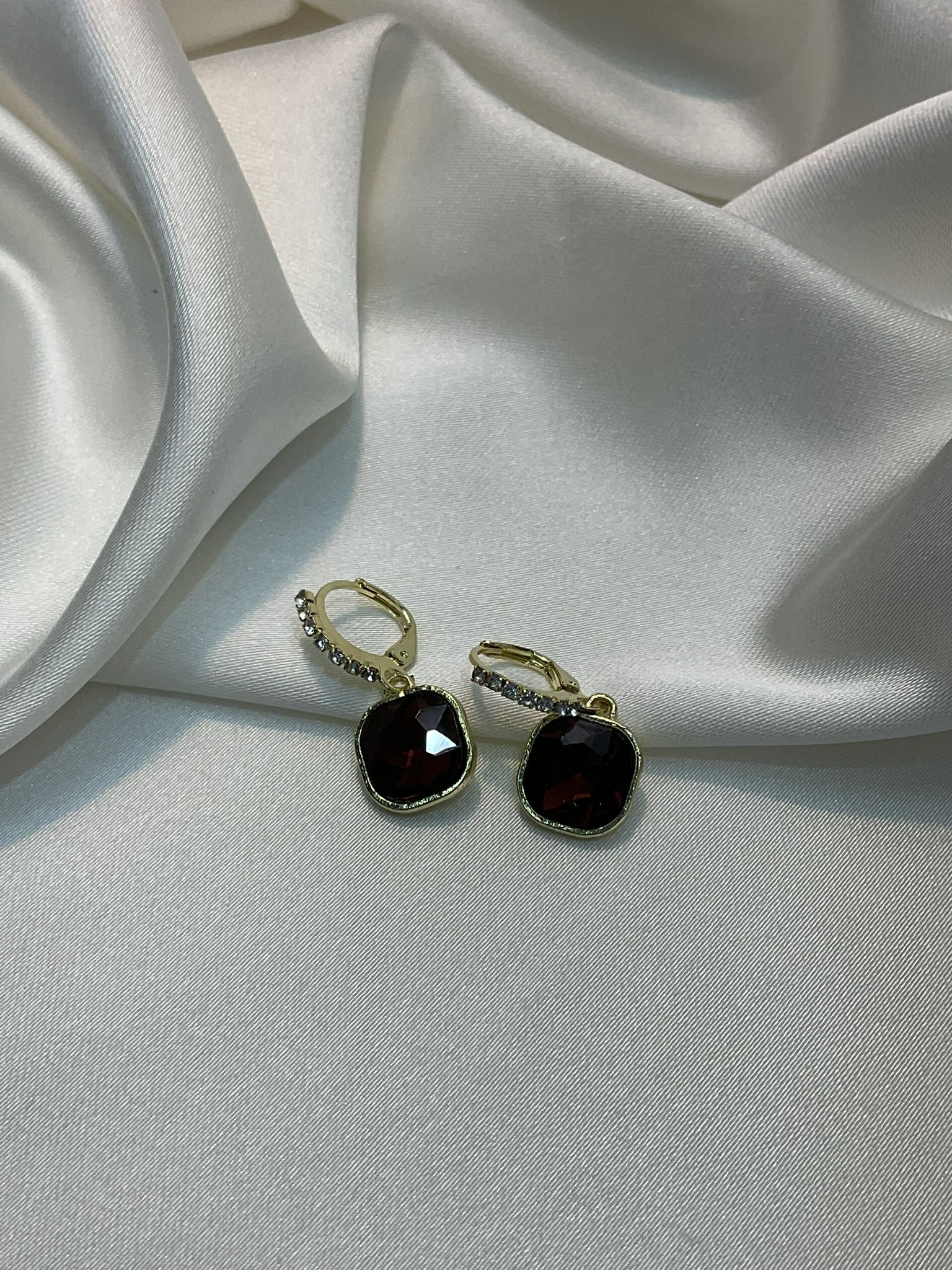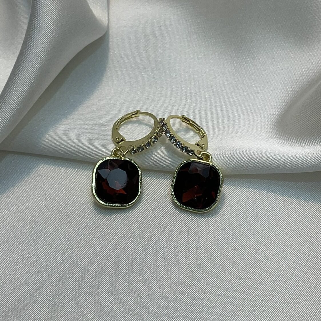Zarif ve göz alıcı bu küpeler, koyu bordo renkli kare kristal taşlarla süslenmiş, her detayıyla şıklığı yansıtan bir tasarım. Parlak kristal detayları ve hafif sallantılı yapısıyla, günlükten geceye her kombine uyum sağlar.