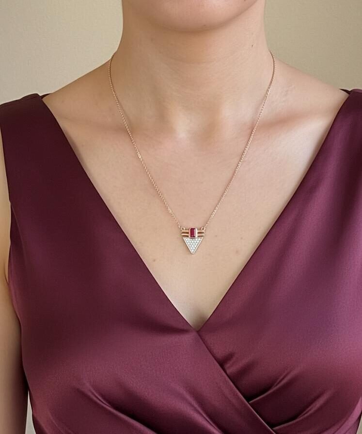 Zarafetin ve modernliğin buluştuğu bu özel tasarım kolye, bordo ışıltı tonundaki taşın enerjisini ışıltılı üçgen detayla bir araya getiriyor.